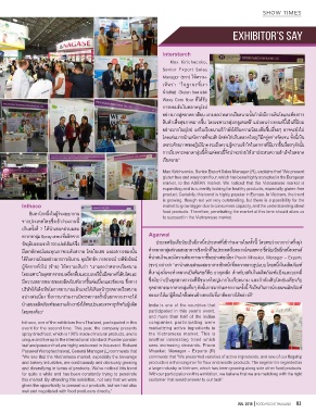 บริษัทได้เล็งเห็นโอกาสมานานแล้วและได้เดินหน้ารุกตลาดเวียดนาม อุตสาหกรรมอาหารกลุ่มอื่นๆ ดังนั้นการมาร่วมออกงานครั้งนี้ จึงถือเป็นการน�าเสนอผลิตภัณฑ์