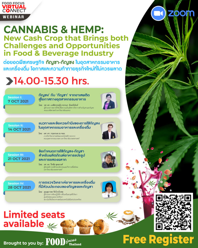 Food Focus Virtual Connect จึงเรียนชวนทุกท่านทำความรู้จักกับกัญชา-กัญชง ร่วมรับฟังข้อมูลในแง่มุมต่างๆ ทั้งในภาพรวม และในเชิงลึกของการนำไปประยุกต์ใช้ในอุตสาหกรรมอาหาร แนวทางการพัฒนาผลิตภัณฑ์ การตรวจสอบหาสารสำคัญ รวมถึงข้อกำหนดที่ต้องรู้ด้านกฏหมายอาหารเกี่ยวกับกัญชง-กัญชา กับงานเว็บบินาร์ 4 หัวข้อ ที่จะทำให้ท่านไม่ตกเทรนด์ และเกาะติดกระแสกัญชา-กัญชง ได้อย่างรู้ลึกและเข้าใจไปพร้อมๆ กัน