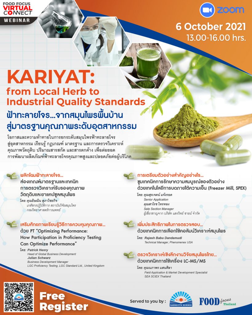 หากคุณมีความสนใจในการต่อยอดผลิตภัณฑ์จากฟ้าทะลายโจร มาร่วมเรียนรู้โอกาสและความท้าทายในการยกระดับสมุนไพรฟ้าทะลายโจรสู่อุตสาหกรรมไปด้วยกัน กับผู้เชี่ยวชาญที่จะแบ่งปันความรู้ และเทคนิคการตรวจวิเคราะห์คุณภาพผลิตภัณฑ์ฟ้าทะลายโจรได้ในงานเว็บบินาร์ครั้งนี้