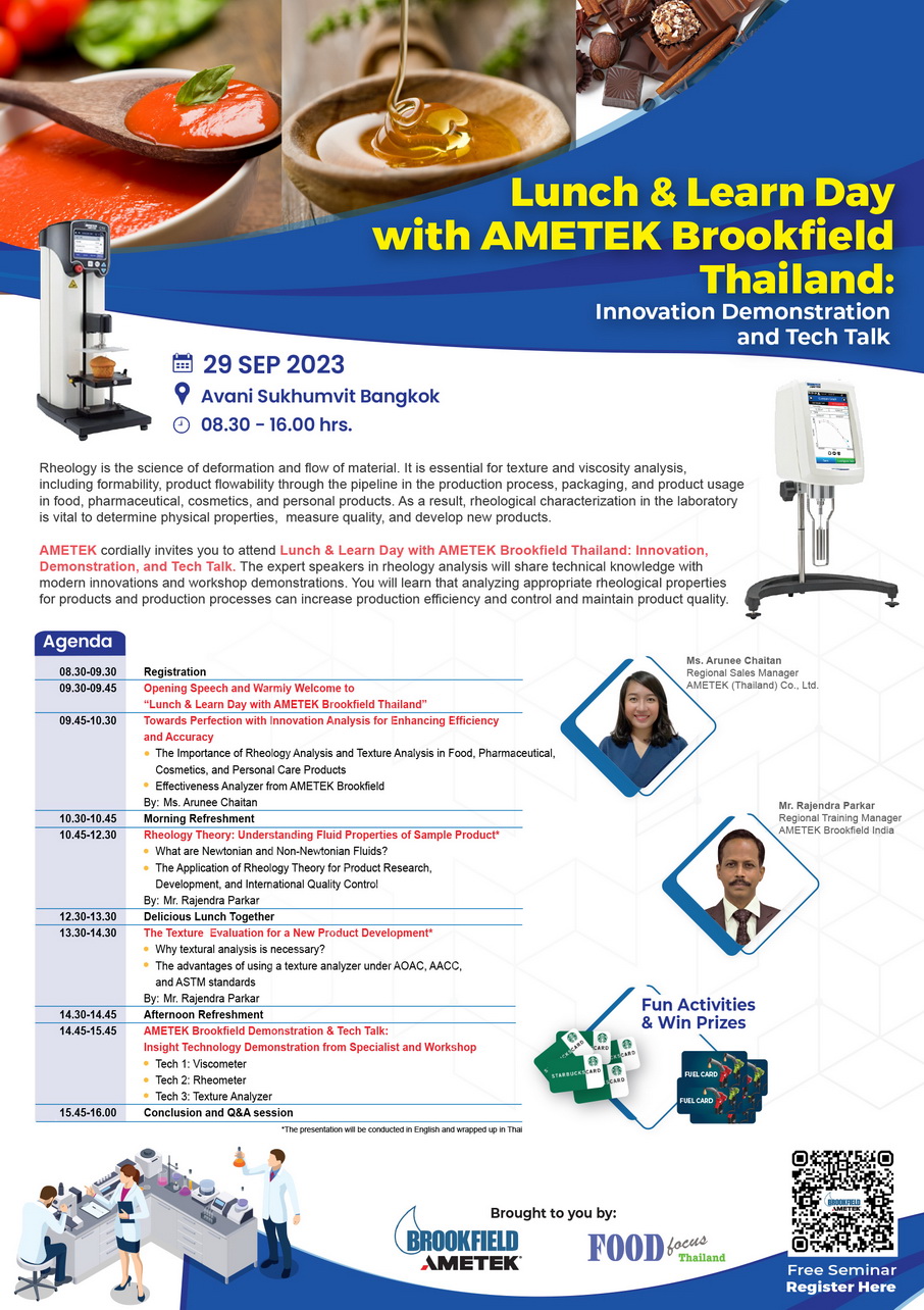 AMETEK cordially invites you to attend Lunch & Learn Day with AMETEK Brookfield Thailand: Innovation, Demonstration, and Tech Talk. The expert speakers in rheology analysis will share technical knowledge with modern innovations and workshop demonstrations. You will learn that analyzing appropriate rheological properties for products and production processes can increase production efficiency and control and maintain product quality.
