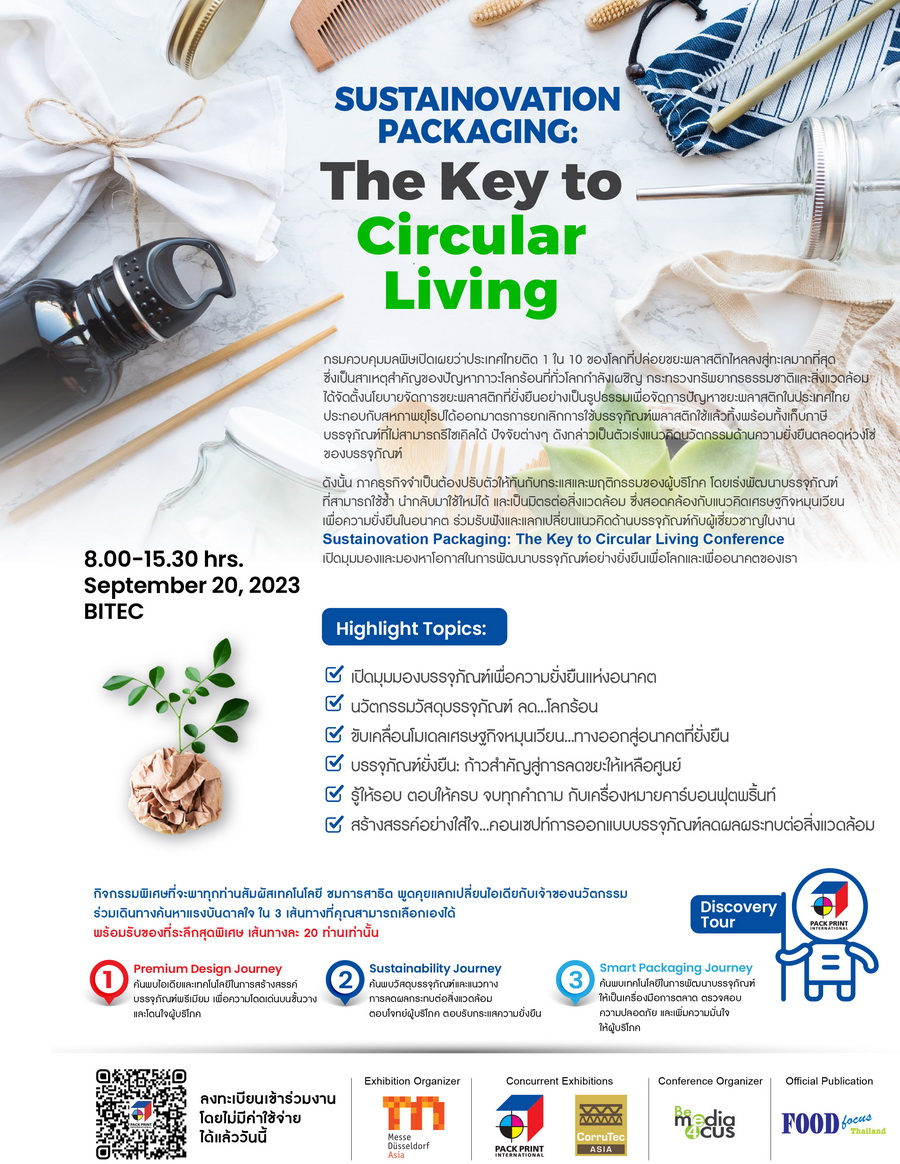 Therefore, business sectors must adapt to this global trend, respond to consumer behavior, and accelerate the development of environmental reuse and recycling packaging that aligns with the circular economy and sustainable future. Meet and exchange ideas with expert speakers at the Sustainovation Packaging: The Key to Circular Living Conference. Open up and seize the opportunity to develop sustainable packaging for our world and the future.