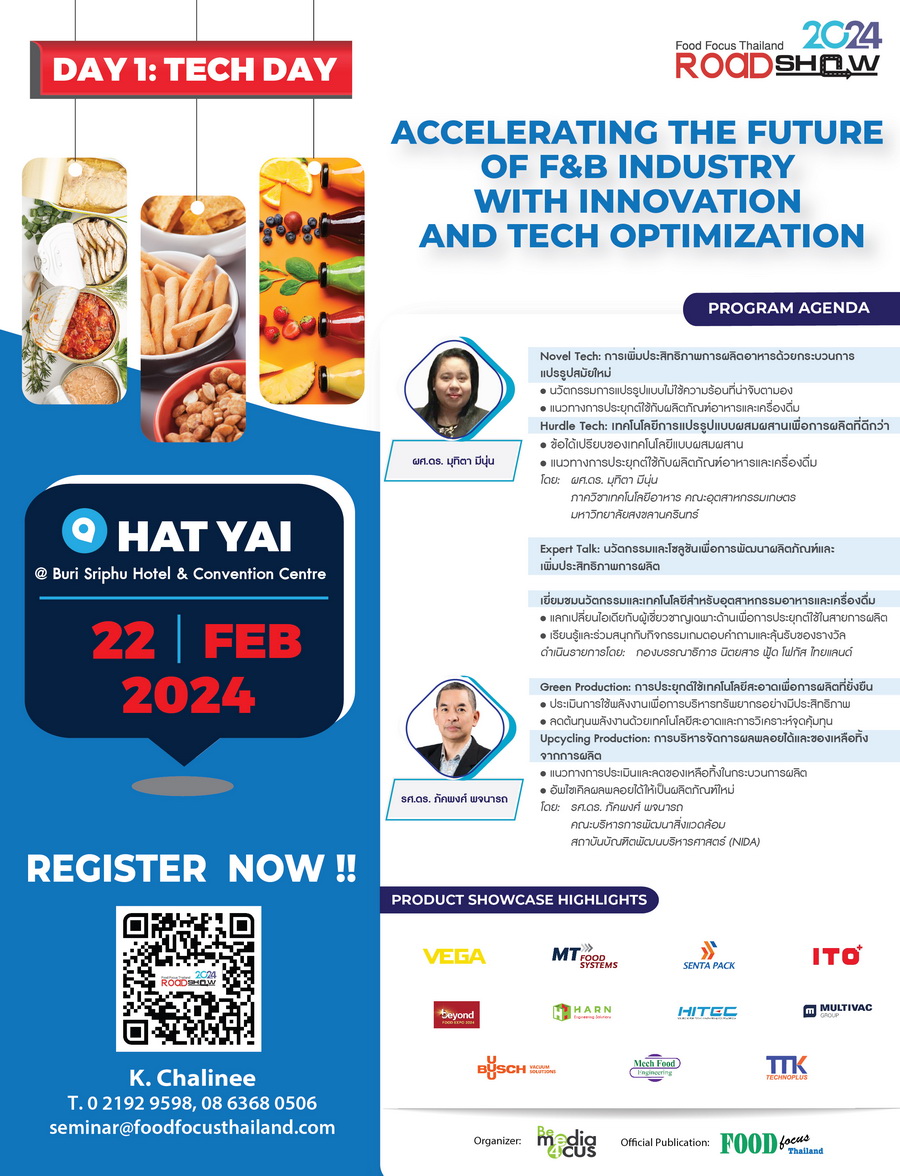 Food Focus Thailand Roadshow 2024 พร้อมเป็นส่วนหนึ่งในการร่วมผลักดันอุตสาหกรรมอาหารของไทยให้ก้าวสู่การเป็นศูนย์กลางผลิตและส่งออกอาหารระดับภูมิภาค (Regional Food HUB) พร้อมสนับสนุนให้อุตสาหกรรมอาหารและเครื่องดื่มของไทยเติบโตอย่างมั่นคงพร้อมรับมือวิกฤตอาหารโลก กับการจัดงานสัมมนาในธีม “ACCELERATING THE FUTURE OF F&B INDUSTRY WITH INNOVATION AND TECH OPTIMIZATION” ขับเคลื่อนอนาคตอุตสาหกรรมอาหารและเครื่องดื่มด้วยนวัตกรรมและเทคโนโลยี