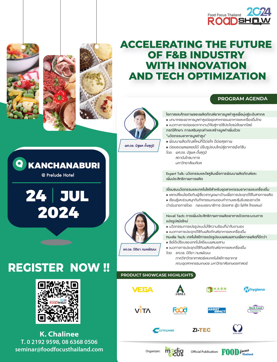 Food Focus Thailand Roadshow 2024 พร้อมเป็นส่วนหนึ่งในการร่วมผลักดันอุตสาหกรรมอาหารของไทยให้ก้าวสู่การเป็นศูนย์กลางผลิตและส่งออกอาหารระดับภูมิภาค (Regional Food HUB) พร้อมสนับสนุนให้อุตสาหกรรมอาหารและเครื่องดื่มของไทยเติบโตอย่างมั่นคงพร้อมรับมือวิกฤตอาหารโลก กับการจัดงานสัมมนาในธีม “ACCELERATING THE FUTURE OF F&B INDUSTRY WITH INNOVATION AND TECH OPTIMIZATION” ขับเคลื่อนอนาคตอุตสาหกรรมอาหารและเครื่องดื่มด้วยนวัตกรรมและเทคโนโลยี