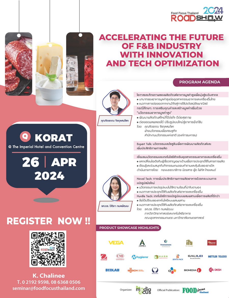Food Focus Thailand Roadshow 2024 พร้อมเป็นส่วนหนึ่งในการร่วมผลักดันอุตสาหกรรมอาหารของไทยให้ก้าวสู่การเป็นศูนย์กลางผลิตและส่งออกอาหารระดับภูมิภาค (Regional Food HUB) พร้อมสนับสนุนให้อุตสาหกรรมอาหารและเครื่องดื่มของไทยเติบโตอย่างมั่นคงพร้อมรับมือวิกฤตอาหารโลก กับการจัดงานสัมมนาในธีม “ACCELERATING THE FUTURE OF F&B INDUSTRY WITH INNOVATION AND TECH OPTIMIZATION” ขับเคลื่อนอนาคตอุตสาหกรรมอาหารและเครื่องดื่มด้วยนวัตกรรมและเทคโนโลยี
