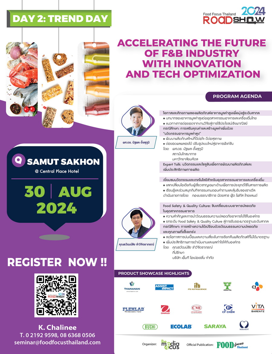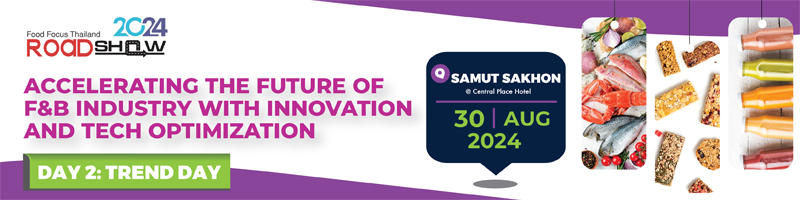 Food Focus Thailand Roadshow 2024 พร้อมเป็นส่วนหนึ่งในการร่วมผลักดันอุตสาหกรรมอาหารของไทยให้ก้าวสู่การเป็นศูนย์กลางผลิตและส่งออกอาหารระดับภูมิภาค (Regional Food HUB) พร้อมสนับสนุนให้อุตสาหกรรมอาหารและเครื่องดื่มของไทยเติบโตอย่างมั่นคงพร้อมรับมือวิกฤตอาหารโลก กับการจัดงานสัมมนาในธีม “ACCELERATING THE FUTURE OF F&B INDUSTRY WITH INNOVATION AND TECH OPTIMIZATION” ขับเคลื่อนอนาคตอุตสาหกรรมอาหารและเครื่องดื่มด้วยนวัตกรรมและเทคโนโลยี