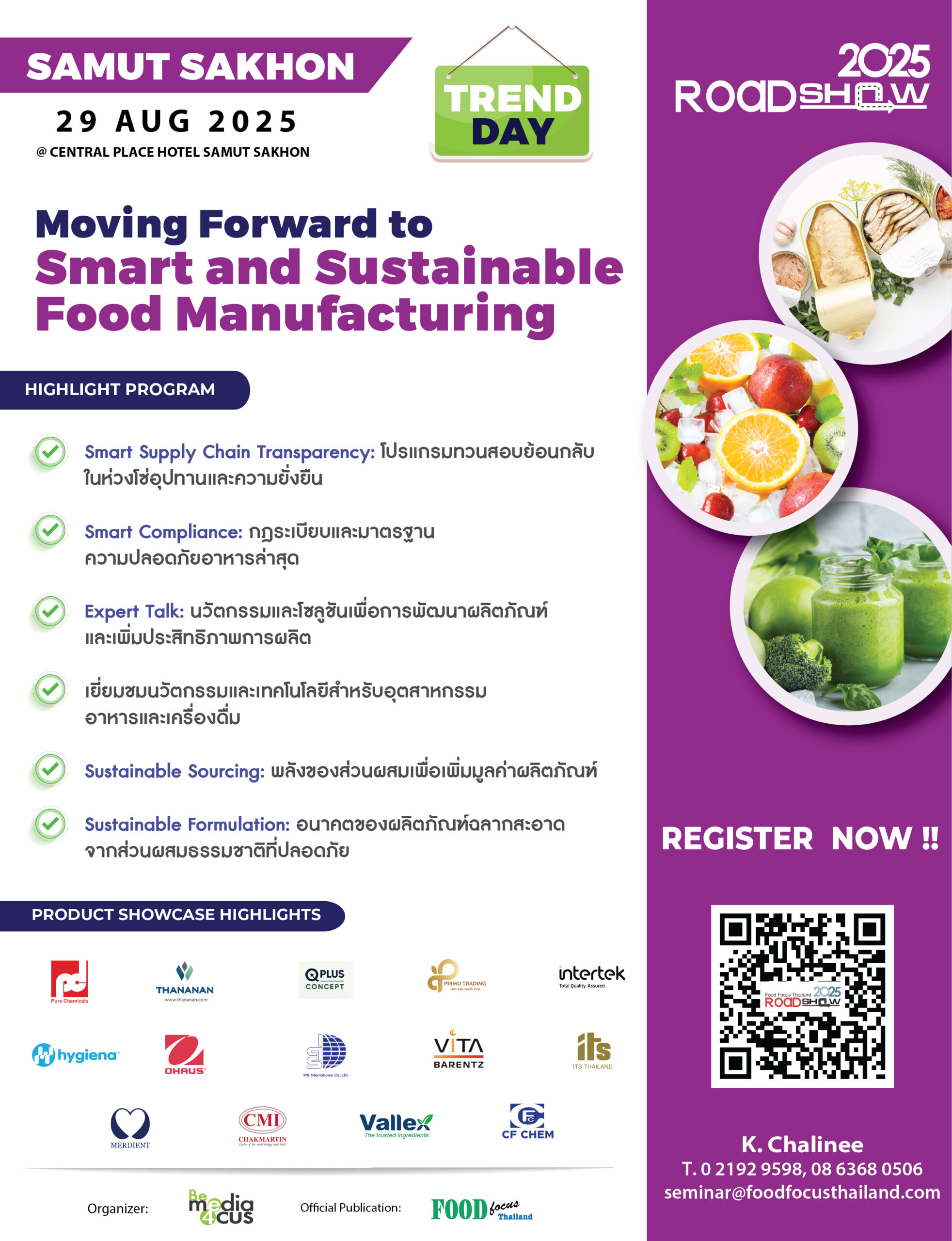 ร่วมปฏิวัติอุตสาหกรรมอาหารและเครื่องดื่มจากผู้เชี่ยวชาญด้านความปลอดภัยอาหาร กับหัวข้อ “Smart Supply Chain Transparency: โปรแกรมทวนสอบย้อนกลับในห่วงโซ่อุปทานและความยั่งยืน” และ “Smart Compliance: กฎระเบียบและมาตรฐานความปลอดภัยอาหารล่าสุด” เพื่อให้ผู้ประกอบการสามารถปรับตัวให้ทันต่อการเปลี่ยนแปลงและเพิ่มโอกาสในการขยายตลาดต่างประเทศ