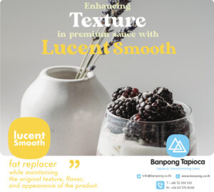 #Banpong #บ้านโป่ง #Lucent #smooth #LucentSmooth #fatreplacer #texturizer #sauce #flavor #appearance #tapioca #enhancer #lowfatfood #starch #texturemodified #BanpongTapioca #อุตสาหกรรมแป้งบ้านโป่ง #snack #crispness #mouthfeel #confectionery #processedMeat #soup #CleanLabel #ฉลากสะอาด #Tapioca #coating #frozenproduct #friedfood #texturesolution