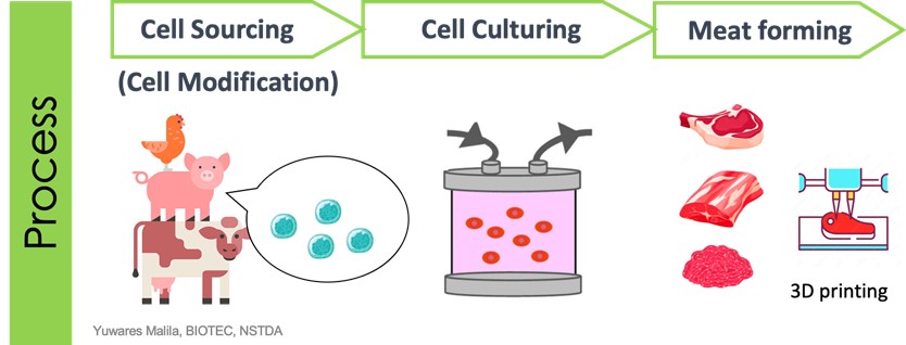 เนื้อสัตว์เพาะเลี้ยงได้รับความสนใจเป็นอย่างมาก เนื่องจากใช้เวลาในการผลิตโปรตีนน้อยกว่าการเลี้ยงสัตว์แบบปกติ ยกตัวอย่างเช่น การเลี้ยงวัวทั่วไปใช้เวลา 112 สัปดาห์ ในขณะที่เนื้อวัวเพาะเลี้ยงเซลล์จะใช้เวลาเพียง 12 สัปดาห์เท่านั้น รวมถึงเนื้อสัตว์จากการเพาะเลี้ยงเซลล์ยังผลิตจากเซลล์ของสัตว์ชนิดนั้นๆ จึงน่าจะช่วยลดข้อจำกัดด้านรสชาติ และเนื้อสัมผัสของกลุ่มเนื้อเทียมจากพืช (plant-based meat analog) โดยกระบวนการผลิตเนื้อสัตว์เพาะเลี้ยงจากเซลล์สามารถแบ่งออกเป็น (1) การคัดเลือกและเตรียมเซลล์ (cell sourcing) (2) การเพิ่มจำนวนเซลล์ (cell expanding) ในถังปฏิกรณ์ (bioreactor) และ (3) การขึ้นรูปเป็นผลิตภัณฑ์เนื้อสัตว์ (meat forming) ดังแสดงในรูปที่ 1 โดยในแต่ละขั้นตอนจะมีความท้าทายที่แตกต่างกัน ซึ่งความท้าทายหลักของการผลิตเนื้อสัตว์เพาะเลี้ยง คือ การขยายกำลังการผลิตด้วยโจทย์ที่ว่า “จะทำอย่างไรให้ได้เซลล์ที่มีความหนาแน่นสูงสำหรับการผลิตในปริมาณมาก (mass production) และมีราคาที่ไม่เกินกำลังซื้อของผู้บริโภค”