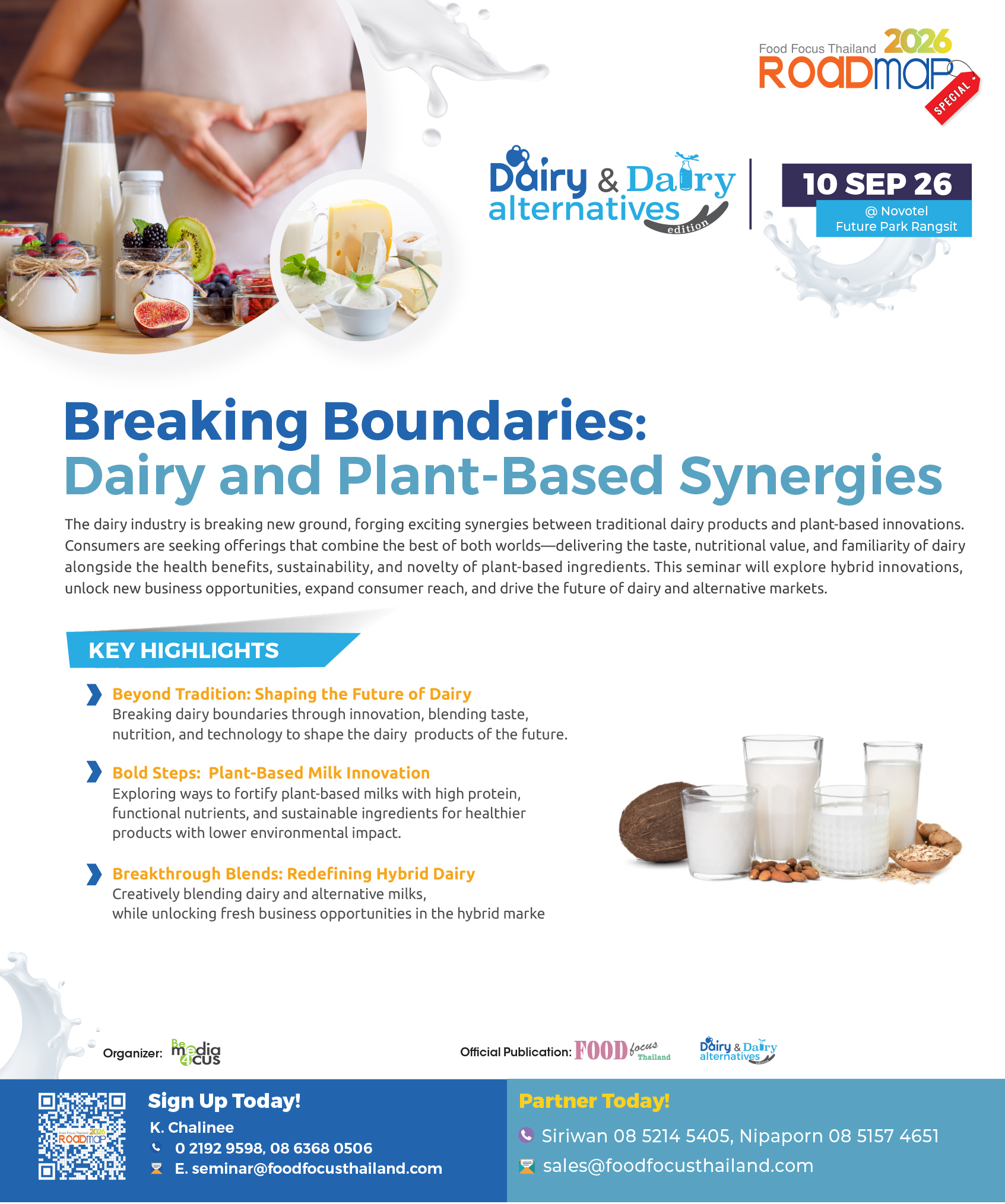 โลกอุตสาหกรรมนมกำลังก้าวข้ามเส้นแบ่งระหว่างผลิตภัณฑ์นมและนวัตกรรมจากพืช ผู้บริโภคยุคใหม่กำลังมองหาผลิตภัณฑ์ที่ผสานข้อดีของทั้งสองโลกเข้าด้วยกัน ทั้งรสชาติ คุณค่าทางโภชนาการ และความคุ้นเคยจากนม ควบคู่กับประโยชน์ด้านสุขภาพ ความยั่งยืน และความแปลกใหม่จากพืช งานสัมมนาครั้งนี้จึงเป็นการเปิดประตูสู่นวัตกรรมและผลิตภัณฑ์ไฮบริดที่ช่วยสร้างโอกาสทางธุรกิจครั้งใหม่ ขยายฐานผู้บริโภค และขับเคลื่อนอุตสาหกรรมด้วยความคิดสร้างสรรค์ที่จะกำหนดอนาคตของตลาดผลิตภัณฑ์นมและนมทางเลือก