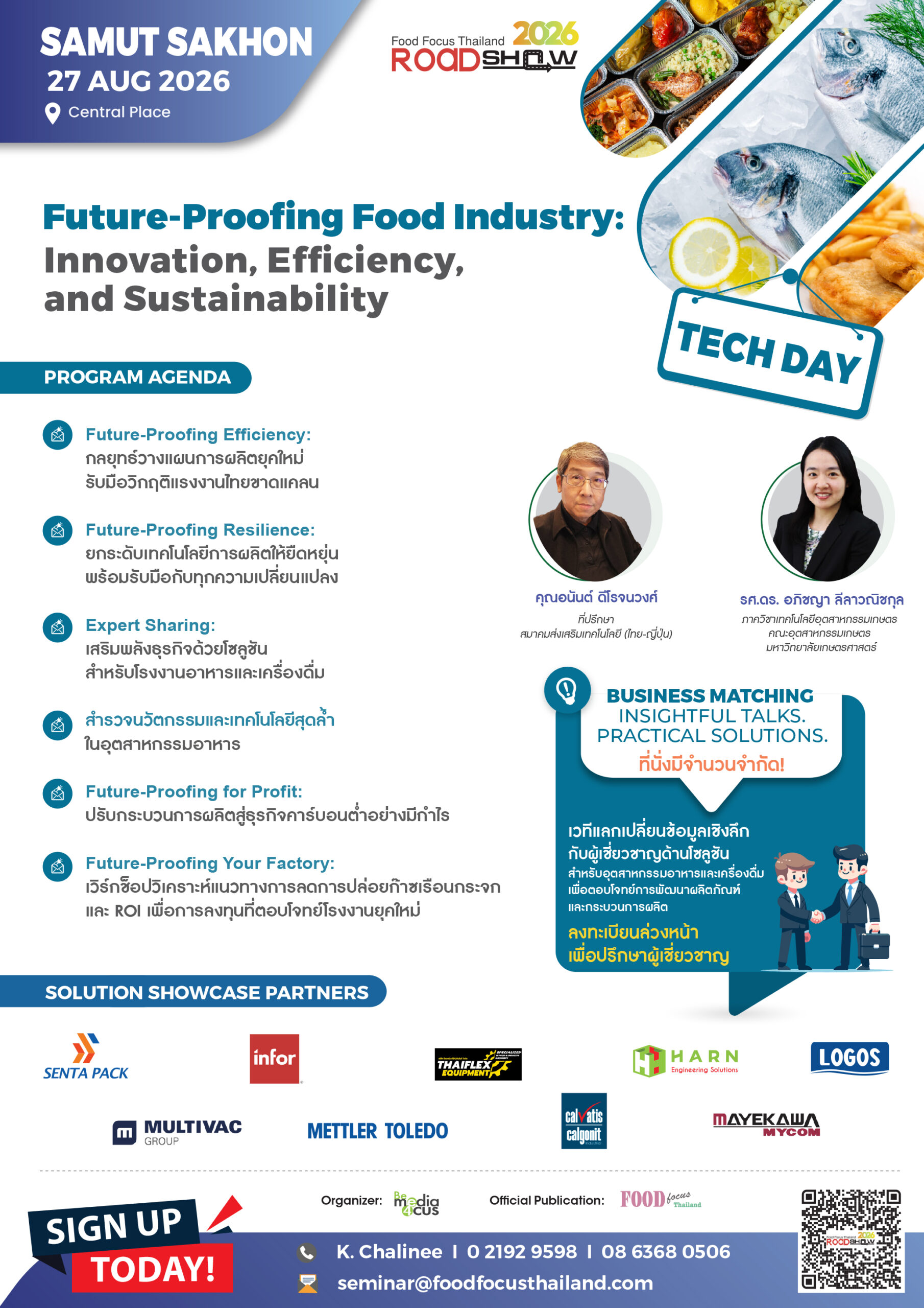 ร่วมเป็นส่วนหนึ่งของการเดินทางสู่ปีที่ 9 กับ FOOD FOCUS THAILAND ROADSHOW 2026 แพลตฟอร์มที่มุ่งยกระดับและขับเคลื่อนอุตสาหกรรมอาหารและเครื่องดื่มของไทยสู่การแข่งขันในระดับโลก เปิดโอกาสให้ผู้ประกอบการได้เข้าถึงนวัตกรรมและเทคโนโลยีที่ล้ำสมัย พร้อมรับฟังความรู้เชิงลึกจากผู้เชี่ยวชาญตัวจริงในแต่ละสาขา สร้างเครือข่ายธุรกิจกับพันธมิตรและคู่ค้าที่แข็งแกร่ง เพื่อพัฒนาผลิตภัณฑ์ที่ตอบโจทย์ ยกระดับกระบวนการผลิตให้มีประสิทธิภาพ บนพื้นฐานความปลอดภัยและเป็นมิตรกับสิ่งแวดล้อม ร่วมผลักดันอุตสาหกรรมอาหารไทยให้เป็นศูนย์กลางการผลิตและส่งออกอาหารระดับภูมิภาคด้วยนวัตกรรมและความยั่งยืน พร้อมโอกาสในการสร้างการรับรู้แบรนด์ ขยายฐานลูกค้าเป้าหมาย และครองส่วนแบ่งการตลาดในอุตสาหกรรมอาหารและเครื่องดื่มที่เติบโตอย่างต่อเนื่อง Future-Proofing Food Industry: Innovation, Efficiency, and Sustainability ท่ามกลางความเปลี่ยนแปลงของโลกที่เกิดขึ้นอย่างต่อเนื่อง ทั้งด้านเศรษฐกิจ สิ่งแวดล้อม และเทคโนโลยี ทำให้อุตสาหกรรมอาหารและเครื่องดื่มกำลังเผชิญกับความท้าทายรอบด้าน ตั้งแต่การจัดหาวัตถุดิบ การผลิต การบริหารห่วงโซ่อุปทาน ไปจนถึงการตอบสนองต่อความต้องการของผู้บริโภคยุคใหม่ที่ให้ความสำคัญกับสุขภาพ ความปลอดภัย และความยั่งยืนมากยิ่งขึ้น การปรับตัวให้ทันต่อกระแสโลกในขณะที่ยังคงรักษาความสามารถในการแข่งขัน จึงกลายเป็นภารกิจสำคัญของผู้ประกอบการในยุคนี้ ภายใต้แนวคิด “Future-Proofing Food Industry: Innovation, Efficiency, and Sustainability” จึงมุ่งเน้นไปที่การเสริมสร้างศักยภาพของอุตสาหกรรมอาหารไทยให้พร้อมรับมือกับอนาคตอย่างมั่นคง ด้วยการนำ “นวัตกรรม” มาเป็นกลไกหลักในการยกระดับกระบวนการผลิต เพิ่ม “ประสิทธิภาพ” เพื่อให้เกิดความคุ้มค่าและลดผลกระทบต่อสิ่งแวดล้อม ที่พร้อมขับเคลื่อนองค์กรสู่ “ความยั่งยืน” ในทุกมิติ ทั้งด้านเศรษฐกิจ สังคม และสิ่งแวดล้อม