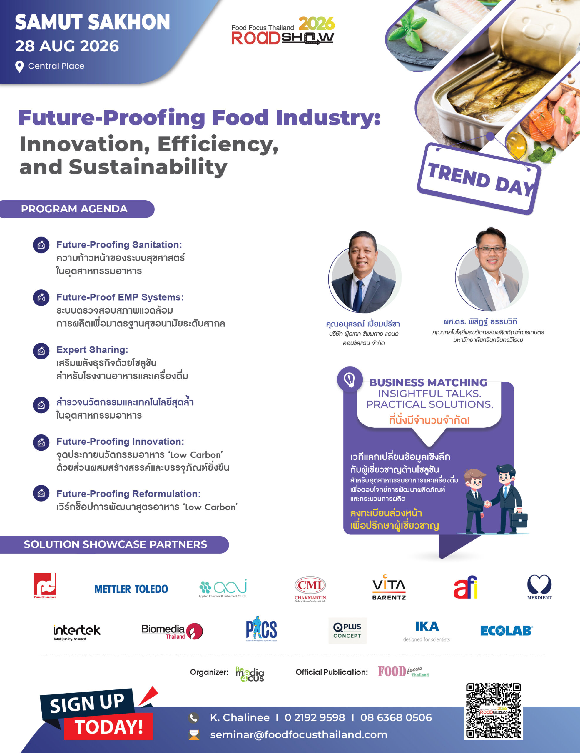 ร่วมเป็นส่วนหนึ่งของการเดินทางสู่ปีที่ 9 กับ FOOD FOCUS THAILAND ROADSHOW 2026 แพลตฟอร์มที่มุ่งยกระดับและขับเคลื่อนอุตสาหกรรมอาหารและเครื่องดื่มของไทยสู่การแข่งขันในระดับโลก เปิดโอกาสให้ผู้ประกอบการได้เข้าถึงนวัตกรรมและเทคโนโลยีที่ล้ำสมัย พร้อมรับฟังความรู้เชิงลึกจากผู้เชี่ยวชาญตัวจริงในแต่ละสาขา สร้างเครือข่ายธุรกิจกับพันธมิตรและคู่ค้าที่แข็งแกร่ง เพื่อพัฒนาผลิตภัณฑ์ที่ตอบโจทย์ ยกระดับกระบวนการผลิตให้มีประสิทธิภาพ บนพื้นฐานความปลอดภัยและเป็นมิตรกับสิ่งแวดล้อม ร่วมผลักดันอุตสาหกรรมอาหารไทยให้เป็นศูนย์กลางการผลิตและส่งออกอาหารระดับภูมิภาคด้วยนวัตกรรมและความยั่งยืน พร้อมโอกาสในการสร้างการรับรู้แบรนด์ ขยายฐานลูกค้าเป้าหมาย และครองส่วนแบ่งการตลาดในอุตสาหกรรมอาหารและเครื่องดื่มที่เติบโตอย่างต่อเนื่อง Future-Proofing Food Industry: Innovation, Efficiency, and Sustainability ท่ามกลางความเปลี่ยนแปลงของโลกที่เกิดขึ้นอย่างต่อเนื่อง ทั้งด้านเศรษฐกิจ สิ่งแวดล้อม และเทคโนโลยี ทำให้อุตสาหกรรมอาหารและเครื่องดื่มกำลังเผชิญกับความท้าทายรอบด้าน ตั้งแต่การจัดหาวัตถุดิบ การผลิต การบริหารห่วงโซ่อุปทาน ไปจนถึงการตอบสนองต่อความต้องการของผู้บริโภคยุคใหม่ที่ให้ความสำคัญกับสุขภาพ ความปลอดภัย และความยั่งยืนมากยิ่งขึ้น การปรับตัวให้ทันต่อกระแสโลกในขณะที่ยังคงรักษาความสามารถในการแข่งขัน จึงกลายเป็นภารกิจสำคัญของผู้ประกอบการในยุคนี้ ภายใต้แนวคิด “Future-Proofing Food Industry: Innovation, Efficiency, and Sustainability” จึงมุ่งเน้นไปที่การเสริมสร้างศักยภาพของอุตสาหกรรมอาหารไทยให้พร้อมรับมือกับอนาคตอย่างมั่นคง ด้วยการนำ “นวัตกรรม” มาเป็นกลไกหลักในการยกระดับกระบวนการผลิต เพิ่ม “ประสิทธิภาพ” เพื่อให้เกิดความคุ้มค่าและลดผลกระทบต่อสิ่งแวดล้อม ที่พร้อมขับเคลื่อนองค์กรสู่ “ความยั่งยืน” ในทุกมิติ ทั้งด้านเศรษฐกิจ สังคม และสิ่งแวดล้อม